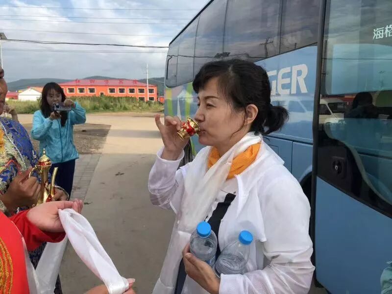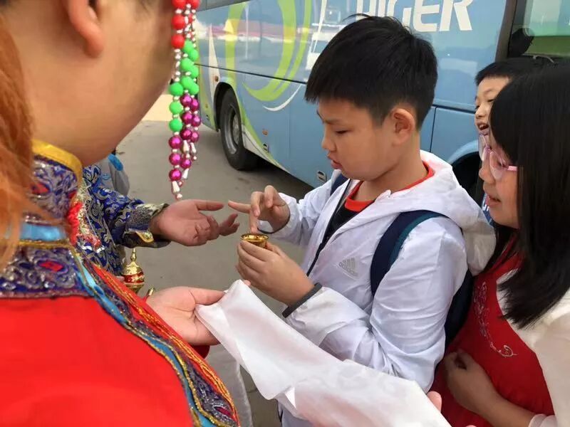 TIPS:下马酒也是蒙古族的重要欢迎仪式,当地的习俗是接过酒杯后不能立马一饮而尽。而是要左手端乘酒银碗,用右手无名指蘸酒弹向天空,称为“敬天”。再蘸酒弹向地面,称为“敬地”,最后蘸酒向前方平弹,称为“敬祖先”,三下过后才能饮酒。我们不能饮酒,但是也了解了下马酒的文化和习俗。