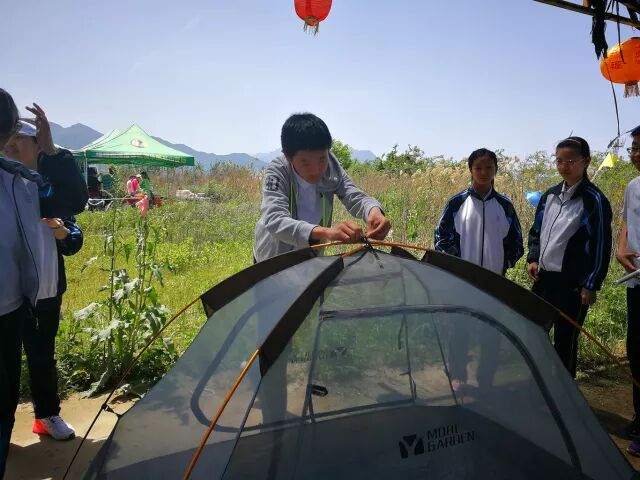营地选择,展帐篷、立支架、打地钉、同学们合理分工,相互配合,过程中讨论、讲解、欢笑连连,最终成功搭建起自己小组的营地帐篷。