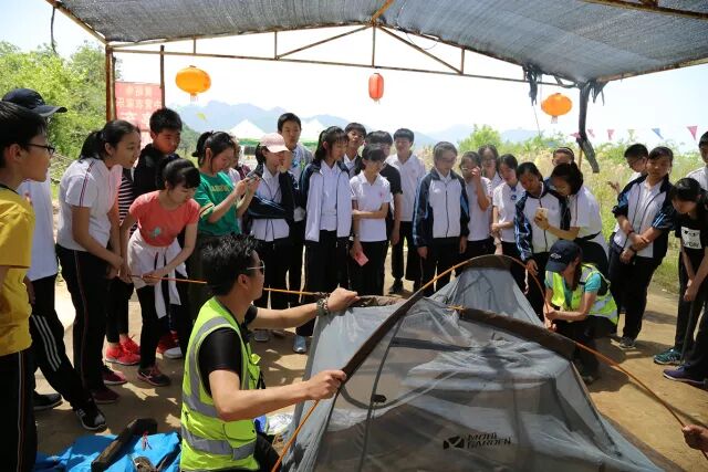 徒步到达户外营地,稍作休息。开始跟着户外老师学习今天最重要的课程——户外生存急救技能,主要是以小组为单位亲手搭建帐篷和救生担架。