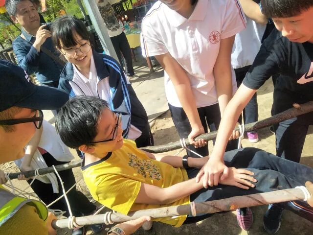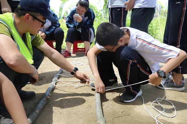 在户外活动中如果有人受伤,或者遇到突发事故,需要制作合适的急救担架。学习制作急救担架的过程更加考验团队合作,还是以小组为单位,准备木棍、拿绳子打结、固定,保证各段绳子用力均衡。